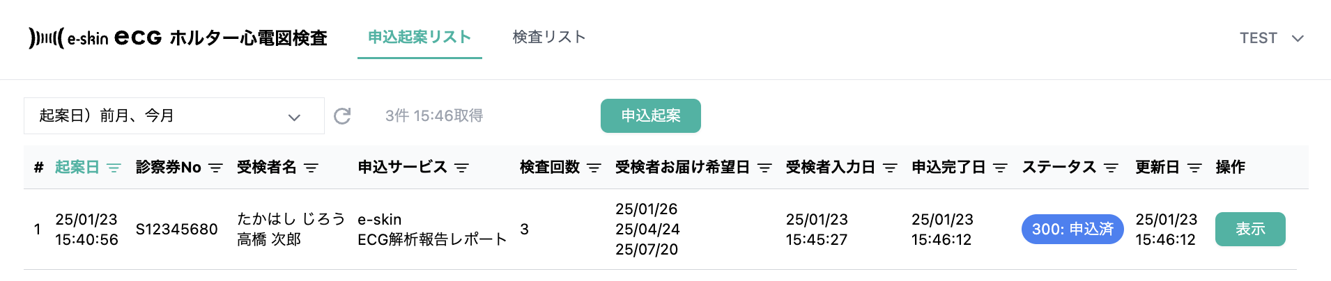 - 申込起案リストに、「100:起案」ステータスが、一行追加されます。