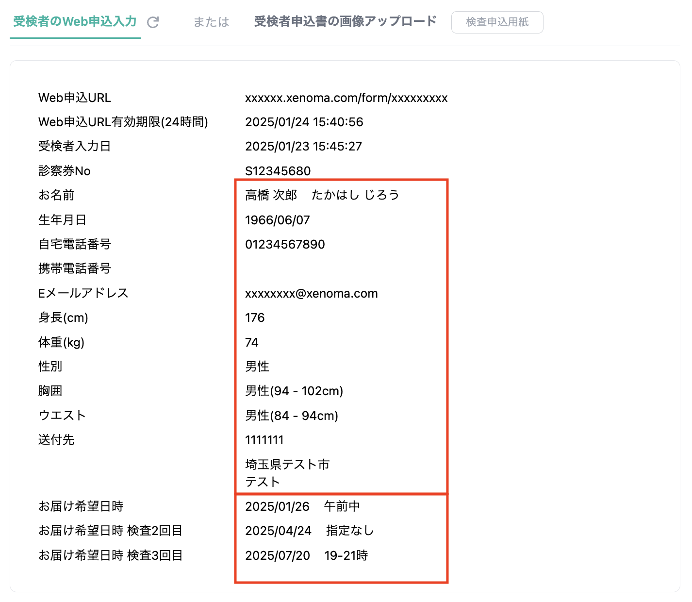 - 「検査回数」「受検者お届け希望日」が、表示されます
